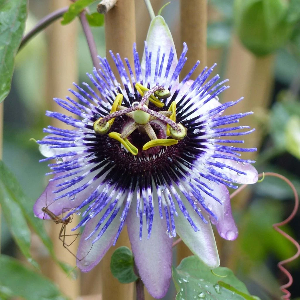 ‘Damsel’s Delight’ est l’un d’entre-eux, obtenu au Royaume Uni par le célèbre créateur de passiflores Myles Irvine et introduit tout récemment sur le marché. Cette plante volubile s’accroche sur son support à l’aide de vrilles, se hissant à plus de 4 m de hauteur. Elle se caractérise par ses tiges quadrangulaires garnies de feuilles découpées en 5 lobes ovales épais, d’un vert foncé brillant, plus ou moins persistantes. Sa floraison, légèrement parfumée, est à son apogée en juin, pluis se poursuit jusqu’en fin d’été, plus sporadiquement. Les fleurs de cette variété sont très grandes, elles mesurent plus de 10 cm de diamètre, mais ne durent qu’une journée. Elles sont formées de grands tépales blancs, ovoïdes, lavés de lilas, la couronne centrale de filaments est striée de violet très foncé, de blanc et de bleu très vif. Le coeur d’étamines en forme de clous est de couleur verte. La forme insolite de la fleur évolue: pétales et sépales se recourbent, tandis que la couronne de filaments se replie puis se redressent, afin d’éviter une autopollinisation. Cette variété hybride ne produit que très peu de fruits. Ceux-ci sont comme de gros oeufs orangé, contenant une chair peu savoureuse, composée de petites vésicules.